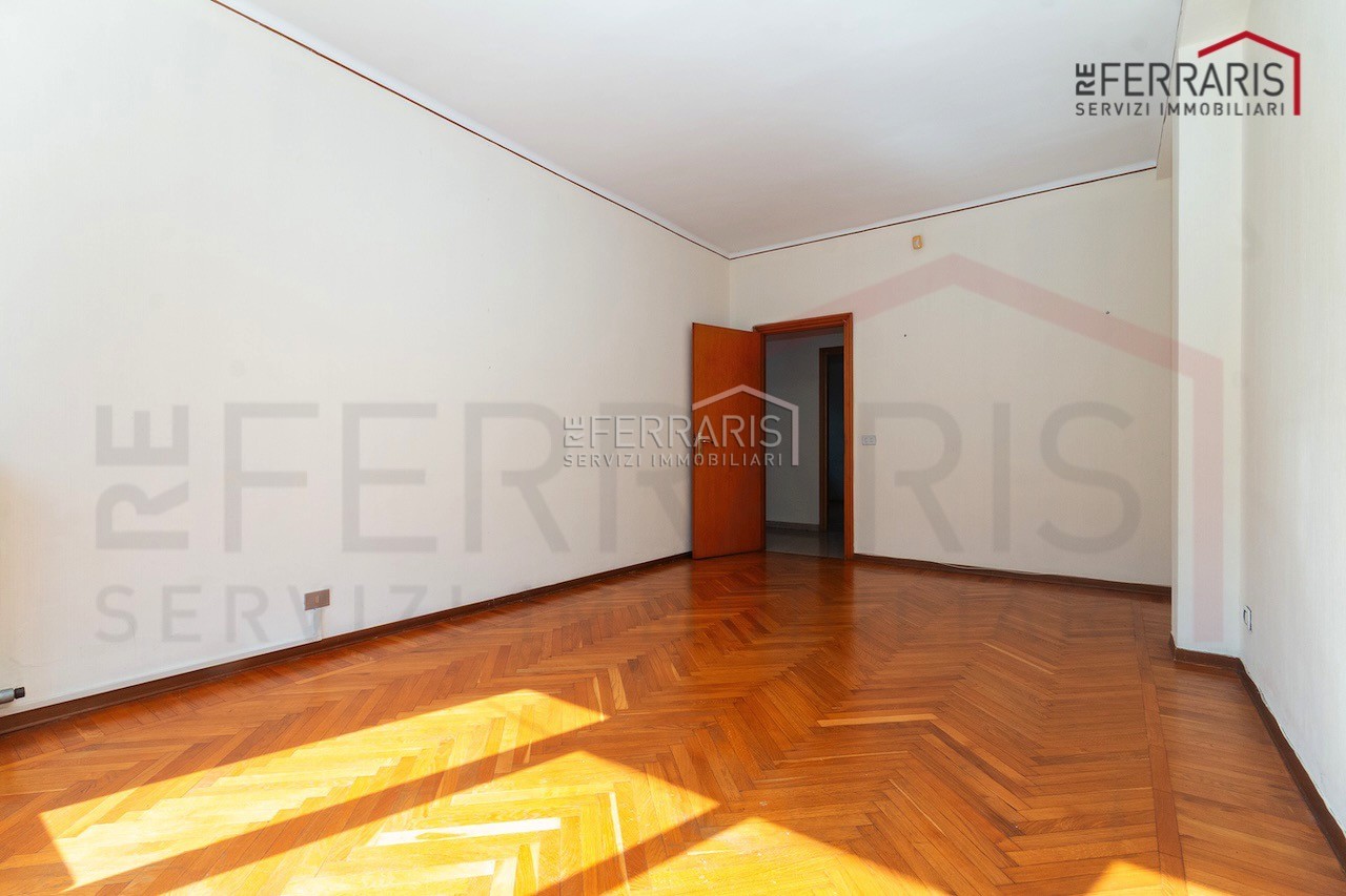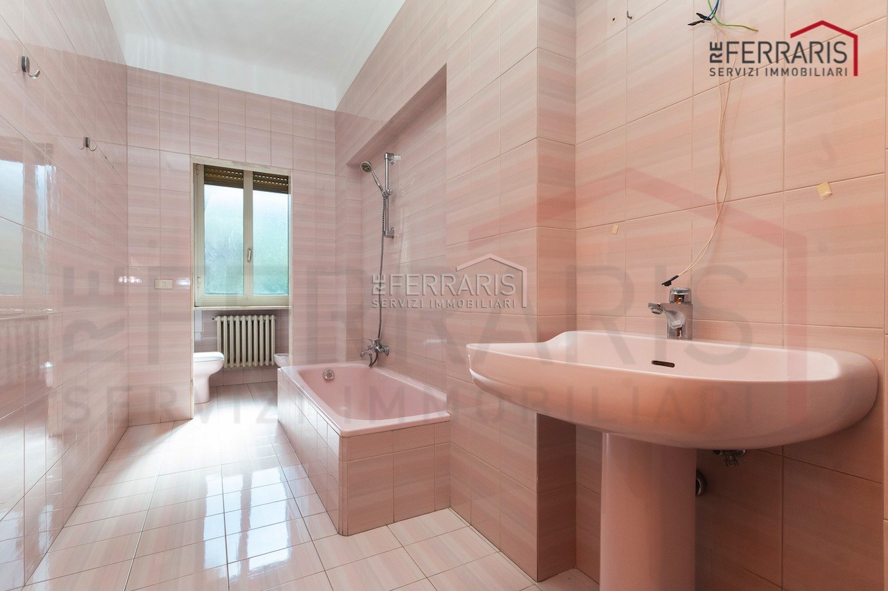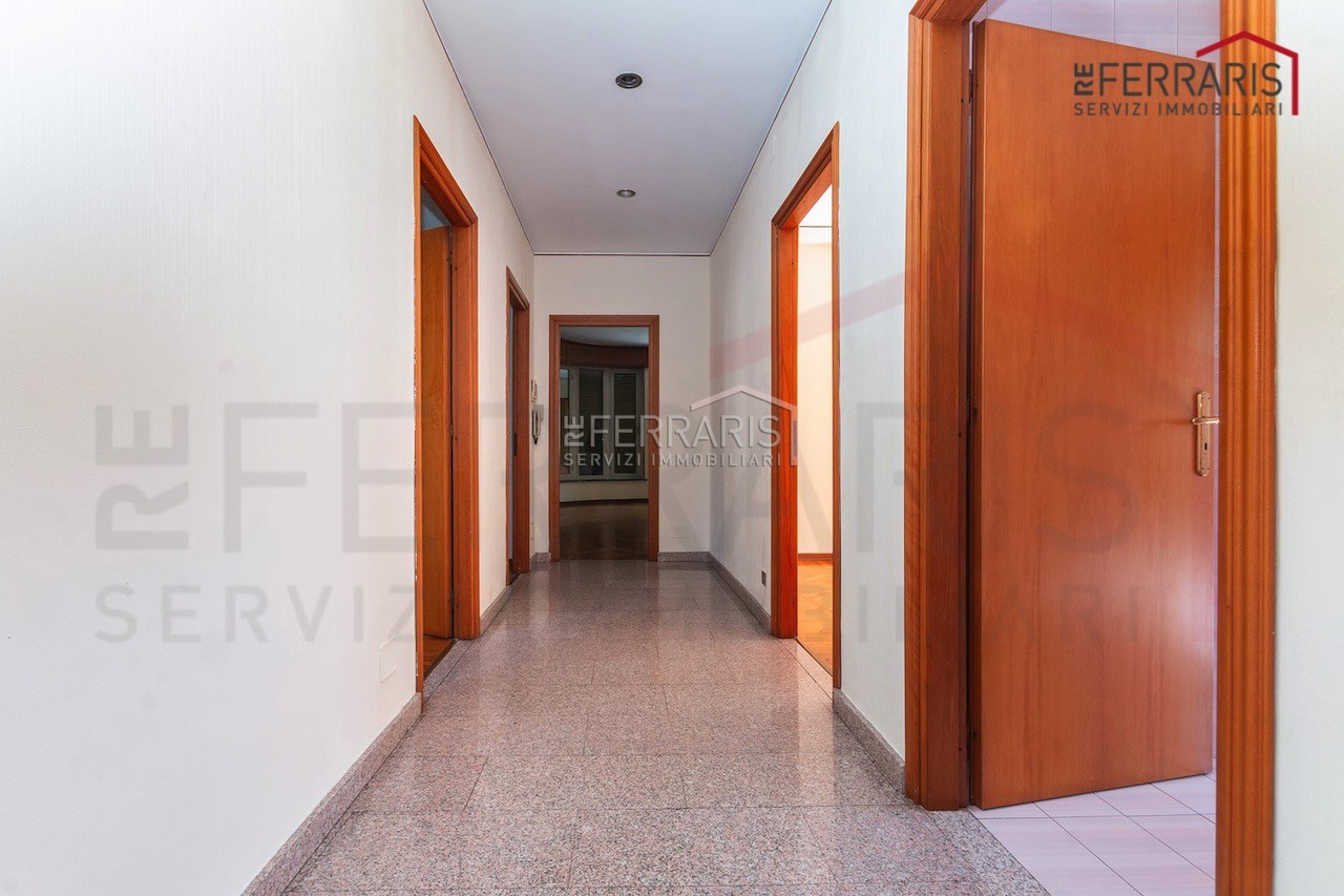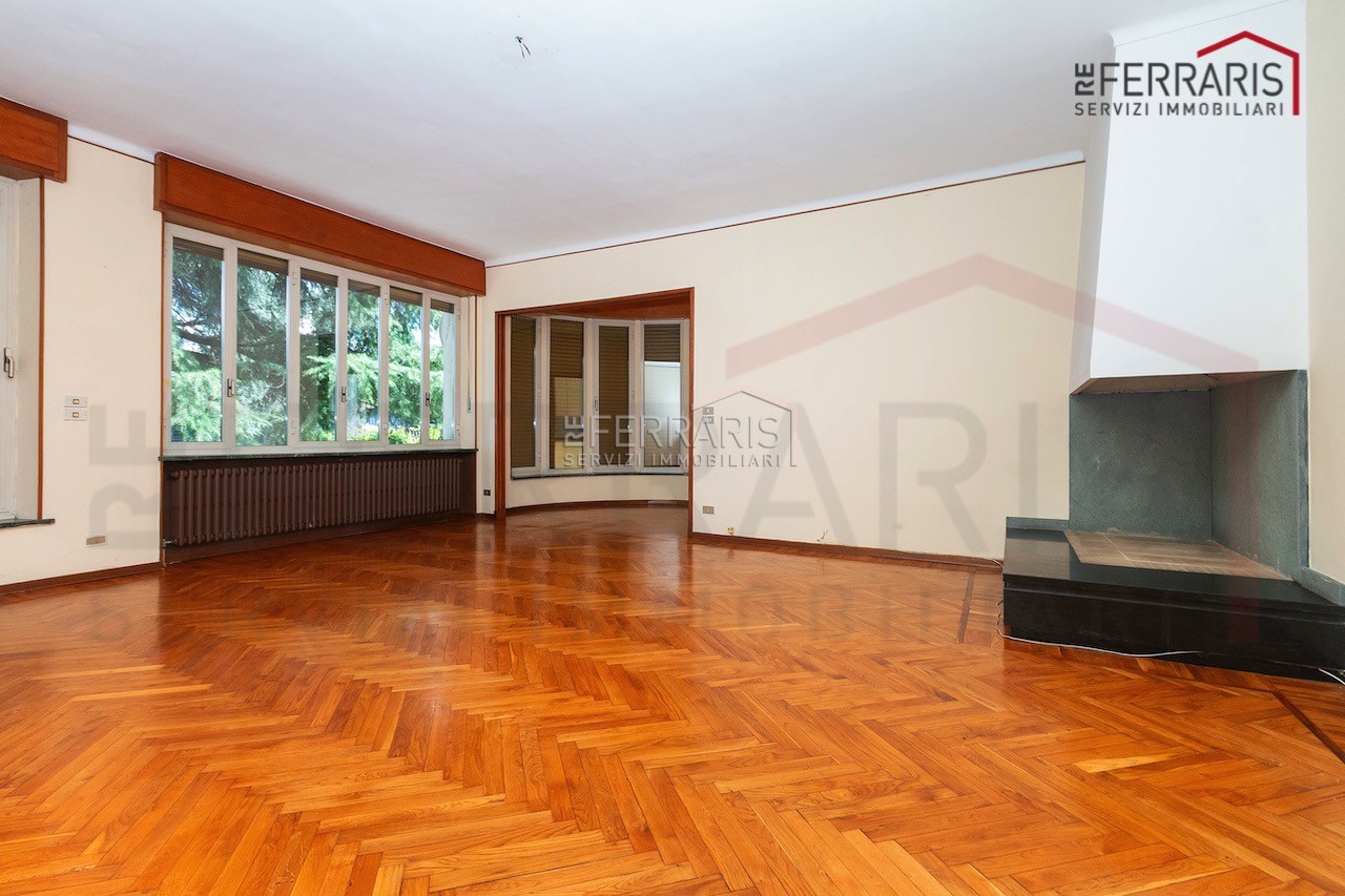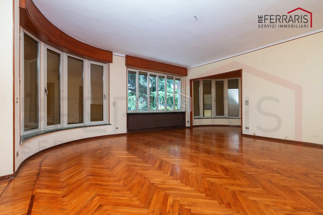 L’unità, caratterizzata da doppi ingressi, si compone di ampio salone di rappresentanza, cucina, cinque grandi camere, disimpegno e doppi servizi. L’immobile gode di accesso diretto al giardino e dispone di box auto.