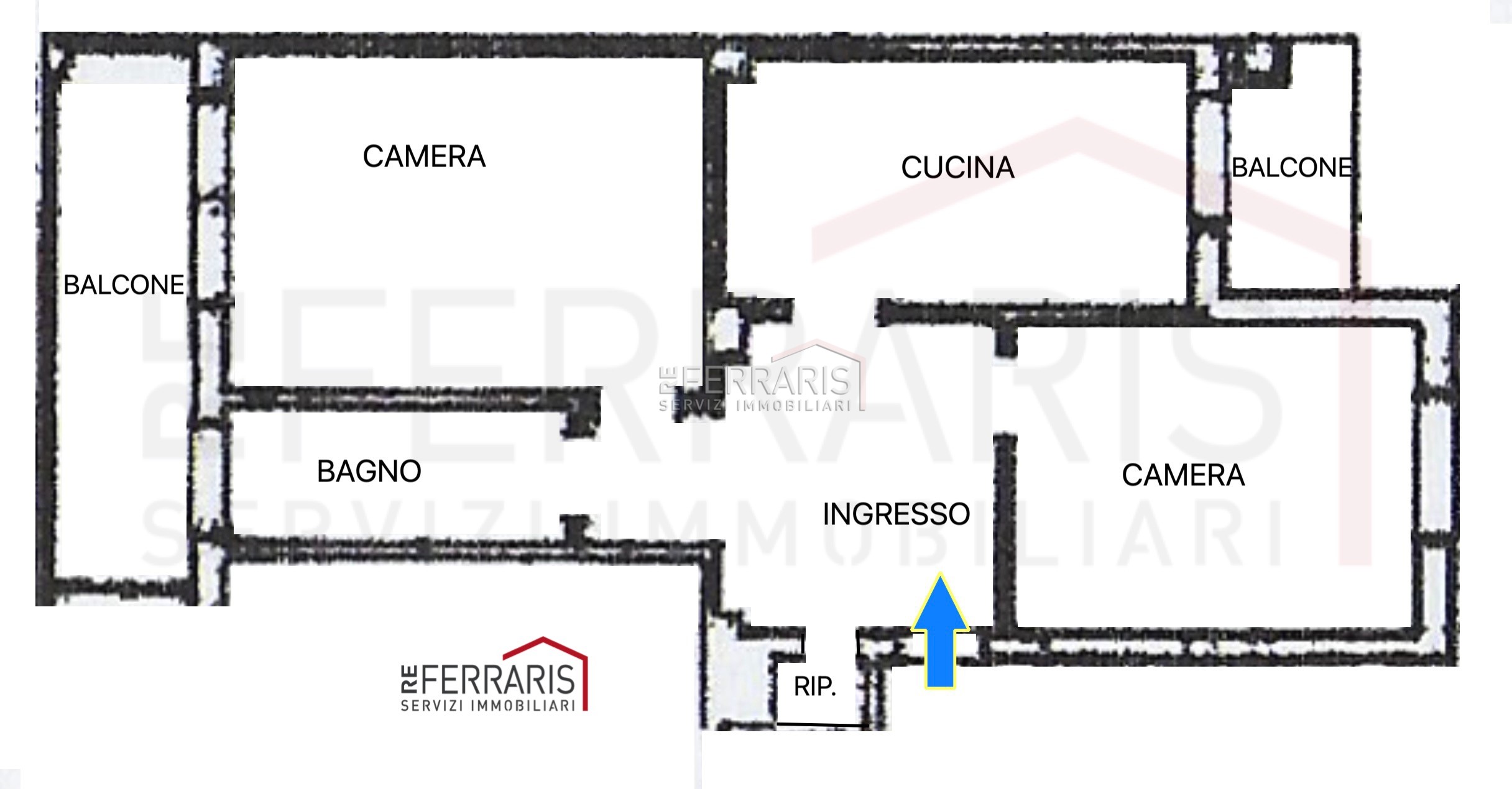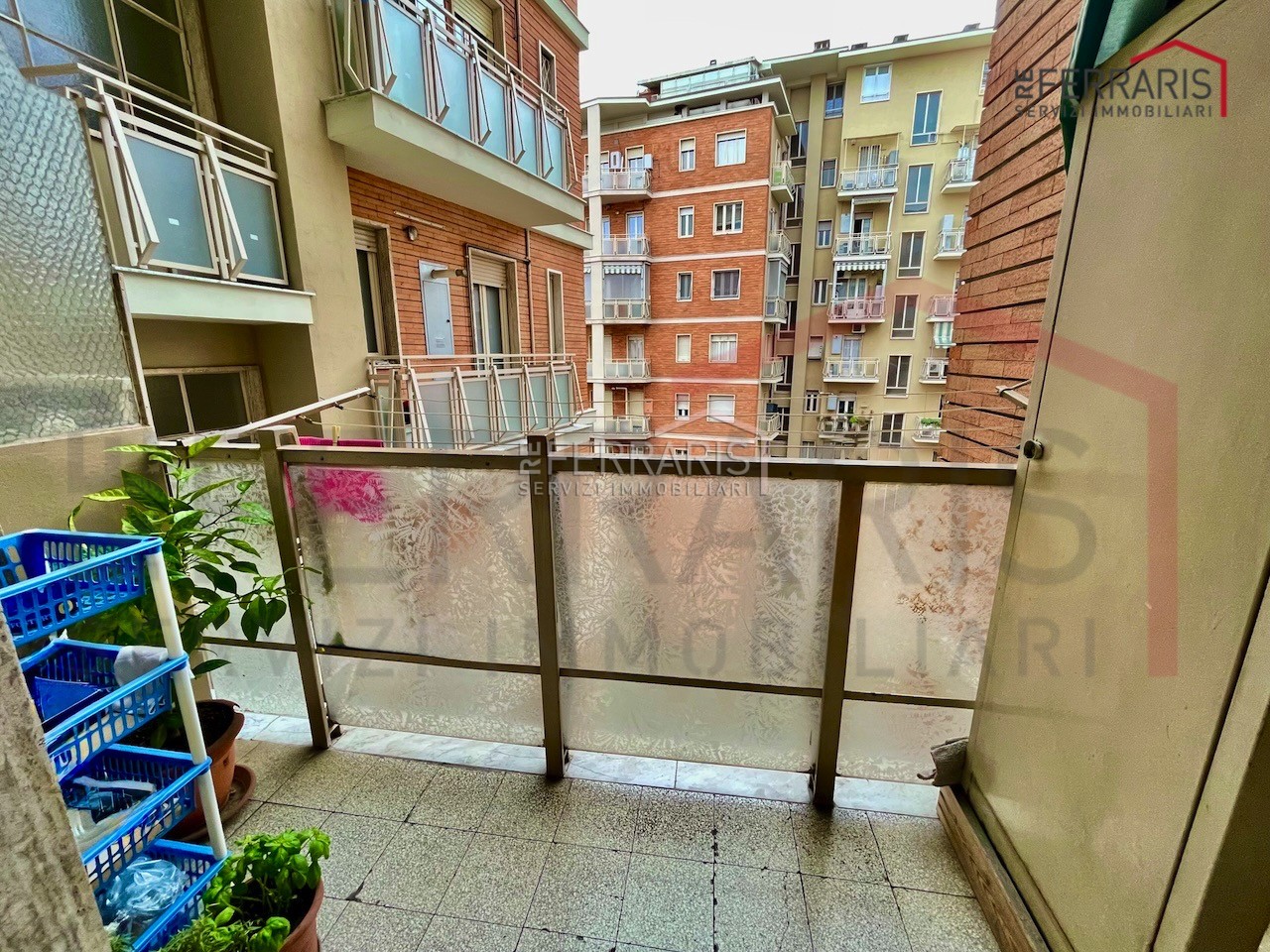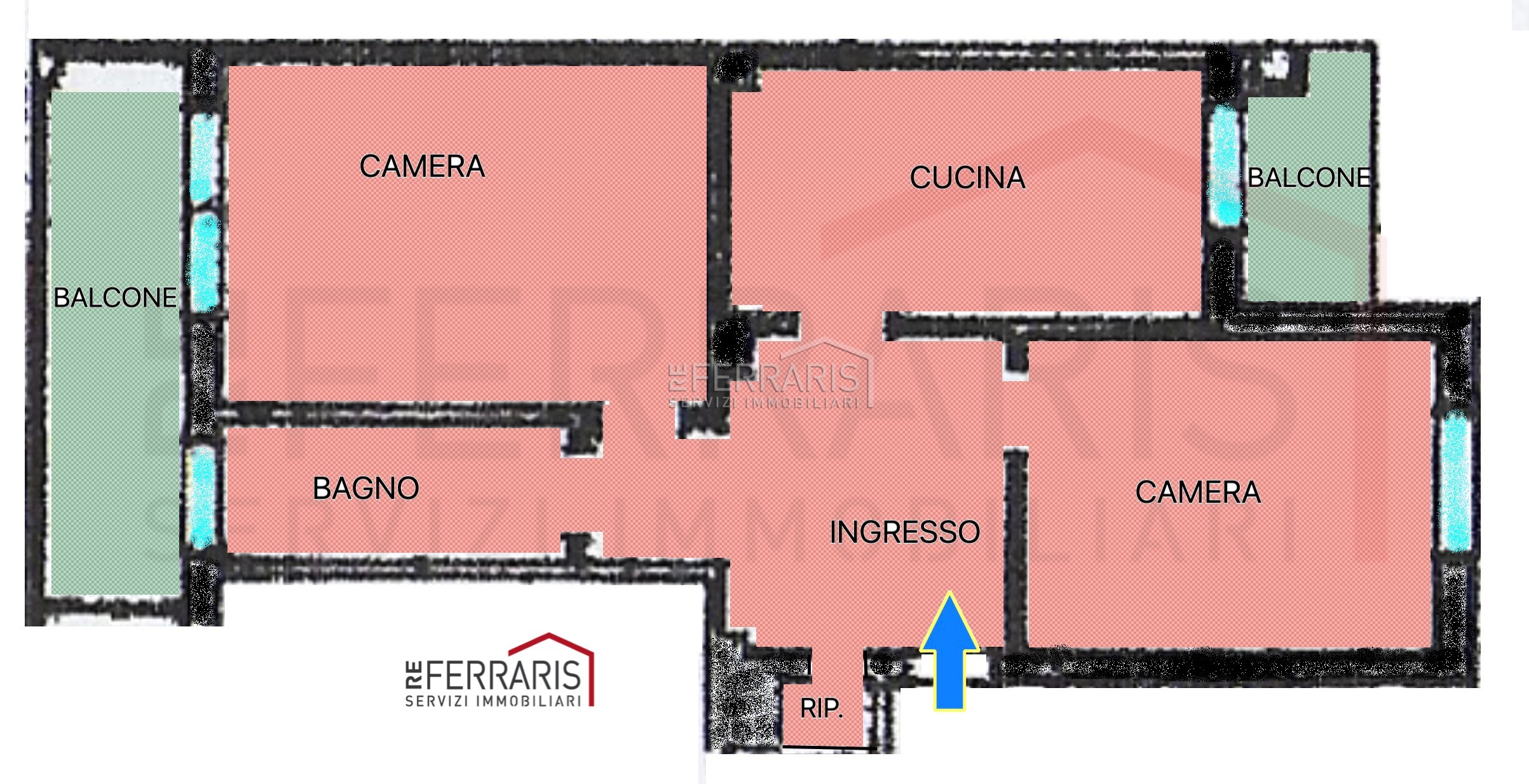 Ingresso, due camere, cucina abitabile, bagno finestrato, due balconi e cantina.